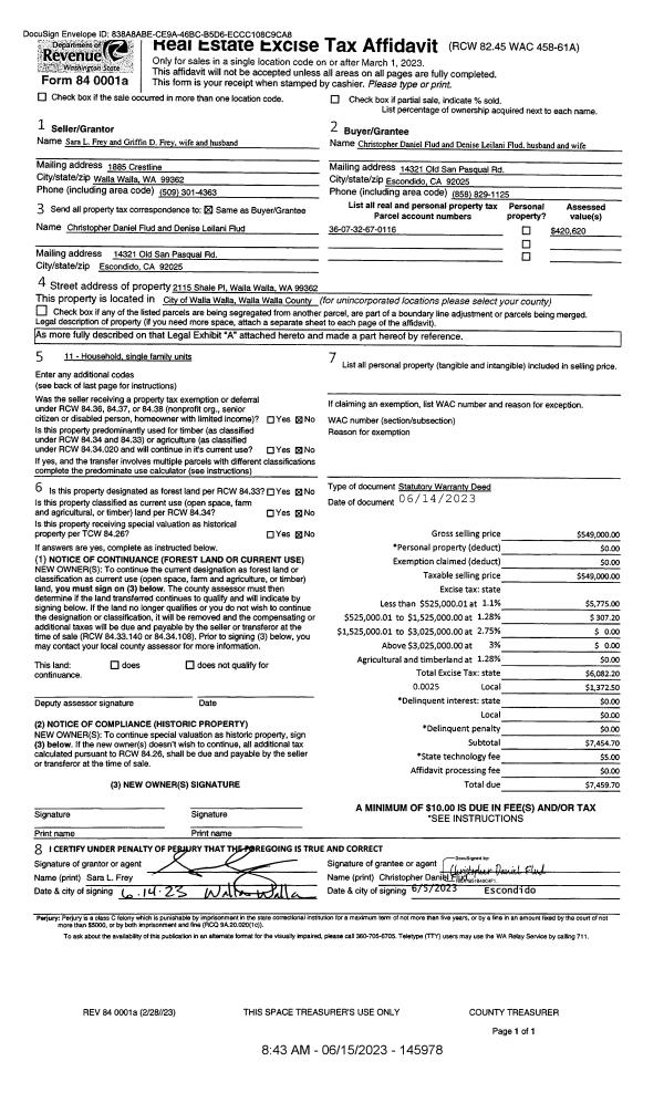 | 2 | 06/15/2023 | SWD | STATUTORY WARRANTY DEED | FREY GRIFFIN D & SARA L | FLUD CHRISTOPHER DANIEL & DENISE LEILANI | | | $549,000.00 | 145978 | 2023-03280 |