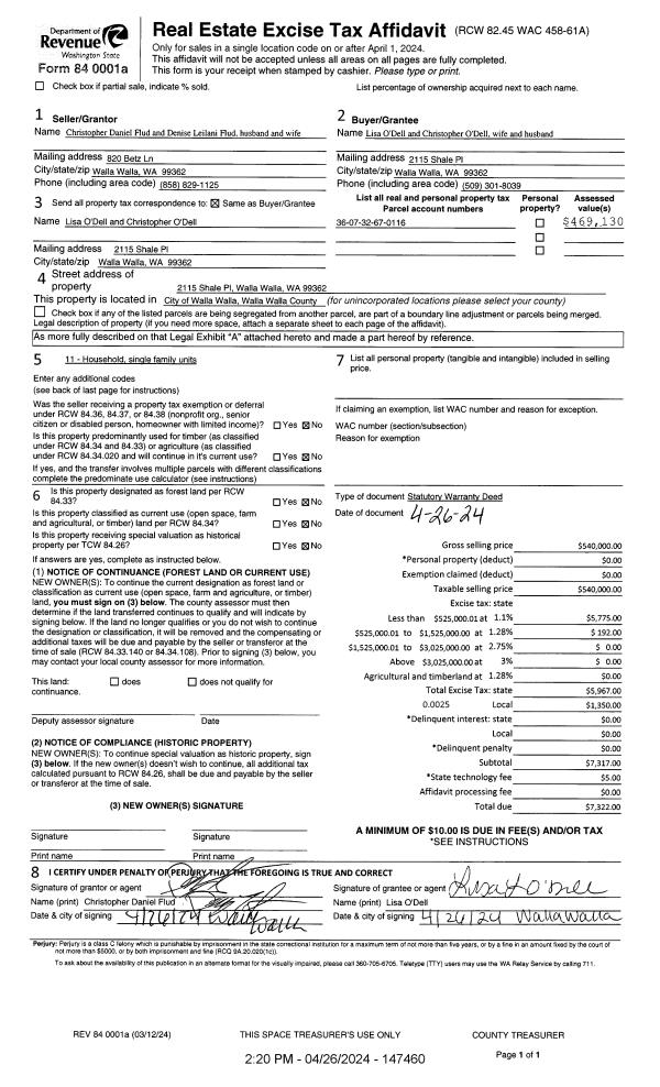 | 1 | 04/26/2024 | SWD | STATUTORY WARRANTY DEED | FLUD CHRISTOPHER DANIEL & DENISE LEILANI | O'DELL LISA & CHRISTOPHER | | | $540,000.00 | 147460 | 2024-02150 |