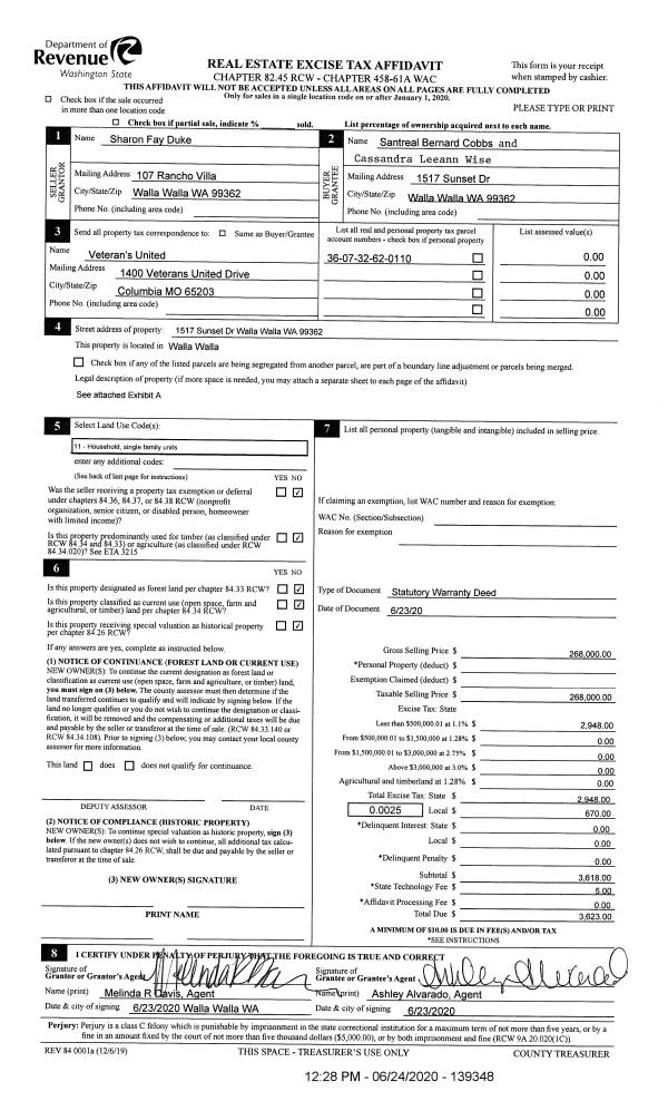 | 1 | 06/24/2020 | SWD | STATUTORY WARRANTY DEED | DUKE SHARON FAY | COBBS SANTREAL BERNARD & CASSANDRA LEEANN WISE | | | $268,000.00 | 139348 | 2020-05805 |