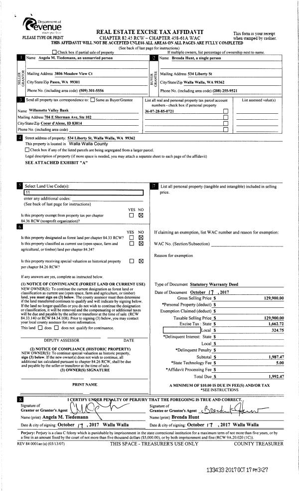 | 6 | 10/17/2017 | SWD | STATUTORY WARRANTY DEED | TIEDEMANN ANGELA M | HUNT BRENDA | | | $129,900.00 | 133433 | 2017-08285 |