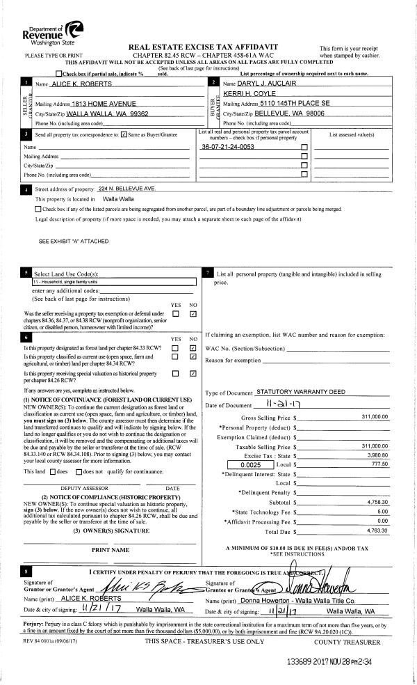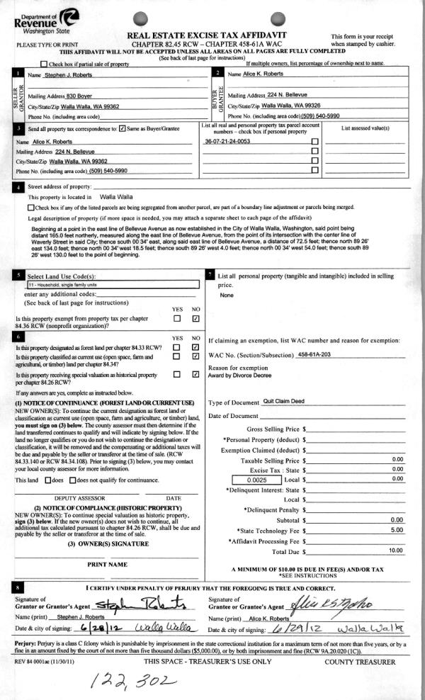 | 4 | 06/29/2012 | WARRANTY D | WARRANTY DEED | ROBERTS, STEPHEN J | ROBERTS, ALICE | | | | 0 | CC #11-3-00300-5 |