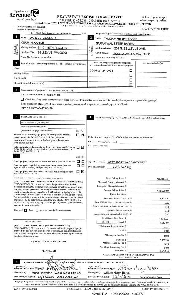 | 1 | 12/03/2020 | SWD | STATUTORY WARRANTY DEED | AUCLAIR DARYL J | BARES WILLIAM HENRY & SARAH WAMESTER | | | $425,000.00 | 140473 | 2020-12776 |