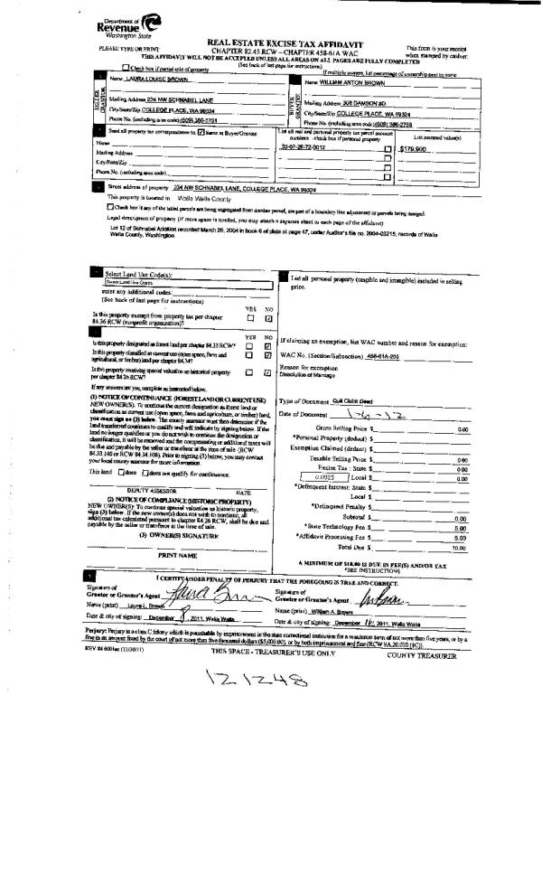 | 2 | 01/09/2012 | QCD | QUIT CLAIM DEED | BROWN, LAURA LOUISE | BROWN, WILLIAM A | | | | 121248 | 2012-00241 |