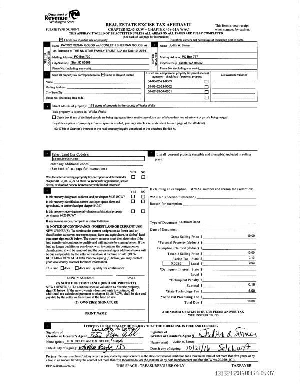 | 6 | 06/01/2015 | QCD | QUIT CLAIM DEED | SINNER JUDITH A | SINNER JUDITH A ET AL | 3 PARCELS | | | 128087 | 2015-04654 |