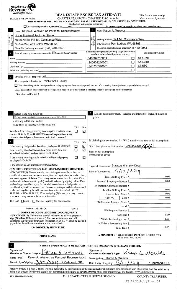 | 4 | 05/17/2019 | SWD | STATUTORY WARRANTY DEED | SINNER JUDITH A | WEAVER KAREN A | | | $0.00 | 137122 | 2019-04390 |