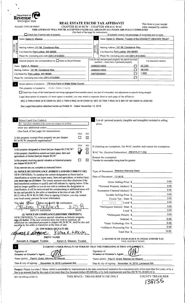 | 3 | 11/14/2019 | SWD | STATUTORY WARRANTY DEED | WEAVER KAREN A | DOGGETT WEAVER TRUST | | 3 PARCELS | $0.00 | 138155 | 2019-09839 |