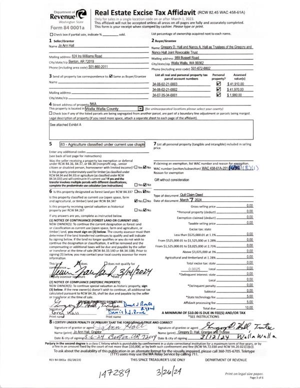 | Mailing Address: | C/O GREGORY & NANCY HALL 989 BUSSELL RD WALLA WALLA, WA 99362 | % Ownership: | 100.0000000000% |