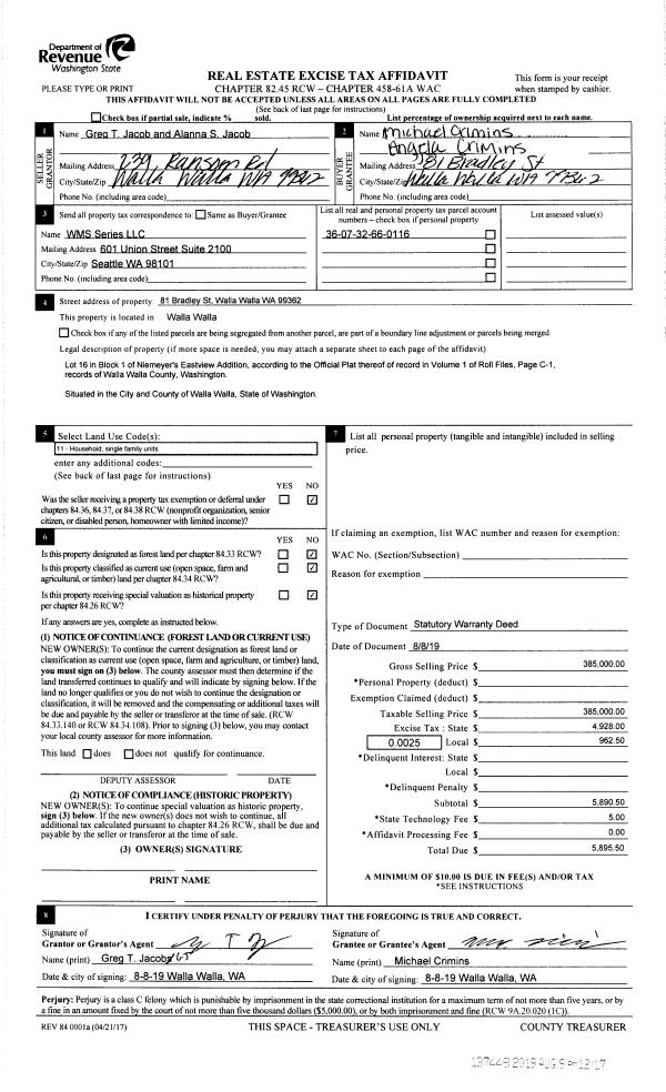 | 1 | 08/09/2019 | SWD | STATUTORY WARRANTY DEED | JACOB GREG T & ALANNA S | CRIMINS MICHAEL & ANGELA | | | $385,000.00 | 137448 | 2019-05941 |