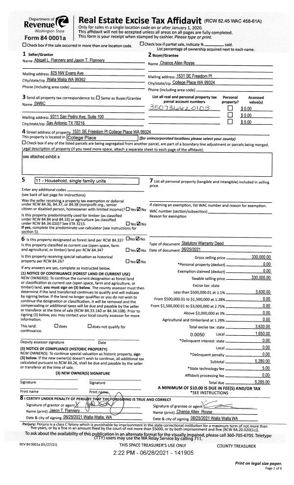 | 2 | 06/28/2021 | SWD | STATUTORY WARRANTY DEED | FLANNERY JASON T & ABIGAIL L | ROYSE CHANCE ALLEN | | | $330,000.00 | 141905 | 2021-07837 |
