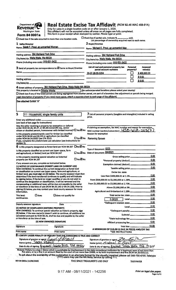 | 2 | 08/04/2021 | QCD | QUIT CLAIM DEED | PROUT MICHAEL E & SARAH F | PROUT MICHAEL E | | | $0.00 | 142256 | 2021-09760 |