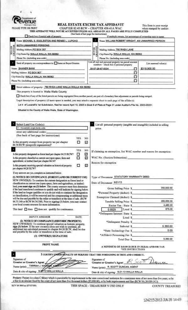 | 2 | 06/28/2013 | WARRANTY D | WARRANTY DEED | EGGLESTON, MICHAEL S & RENEE L | WRIGHT, WILLIAM ROBERT | | | $350,000.00 | 124215 | 2013-06536 |