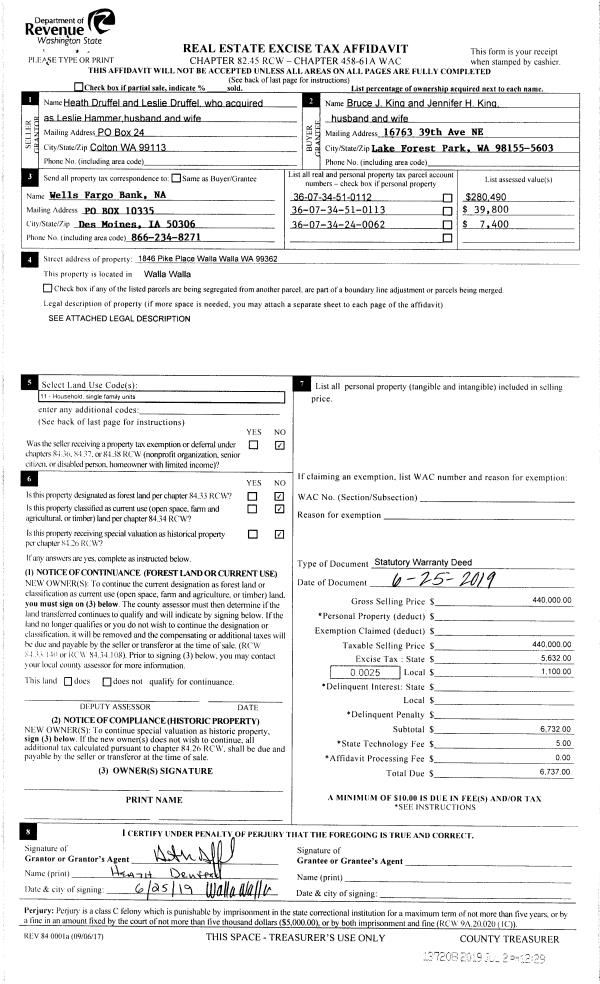 | 1 | 07/02/2019 | SWD | STATUTORY WARRANTY DEED | DRUFFEL HEATH | KING BRUCE J & JENNIFER H | | 3-PARCELS | $440,000.00 | 137208 | 2019-04738 |