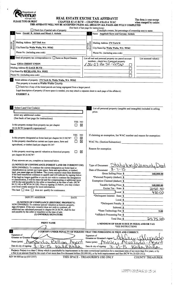 | 1 | 08/10/2015 | SWD | STATUTORY WARRANTY DEED | AICHELE GERALD & MONTI | AICHELE GEREMY | | | $168,000.00 | 128570 | 2015-06896 |