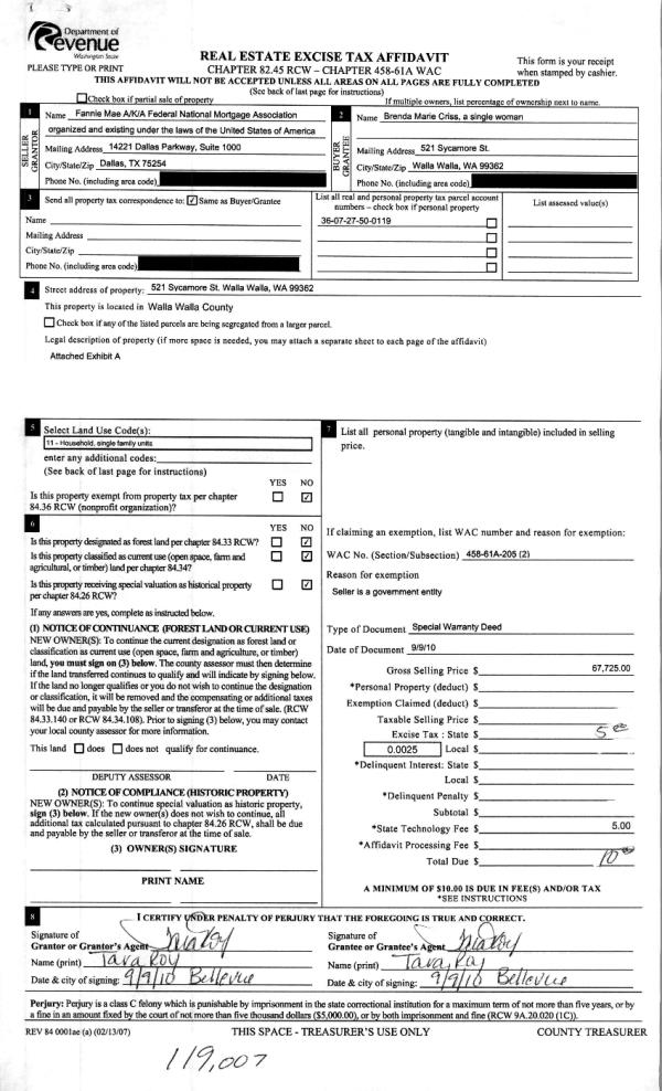 | 6 | 04/15/2010 | WARRANTY D | WARRANTY DEED | NORTHWEST TRUSTEE SERVICES | FEDERAL NATIONAL MORTGAGE~ASSO | | | $126,524.00 | 118347 | 2010-02997 |