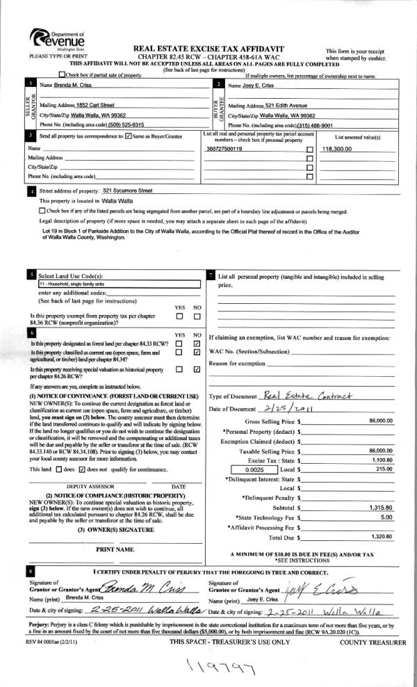 | 4 | 02/28/2011 | WARRANTY D | WARRANTY DEED | CRISS, BRENDA MARIE | CRISS, JOEY E | | | $86,000.00 | 119797 | 2011-01815 |