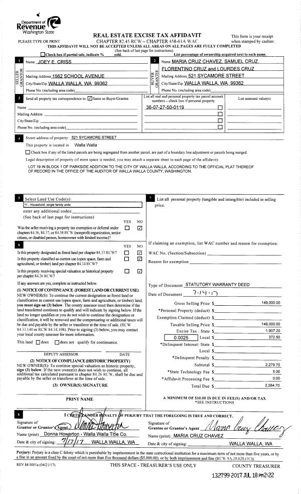 | 3 | 07/18/2017 | SWD | STATUTORY WARRANTY DEED | CRISS JOEY E | CRUZ SAMUEL & MARIA CRUZ CHAVEZ | | | $149,000.00 | 132799 | 2017-05505 |