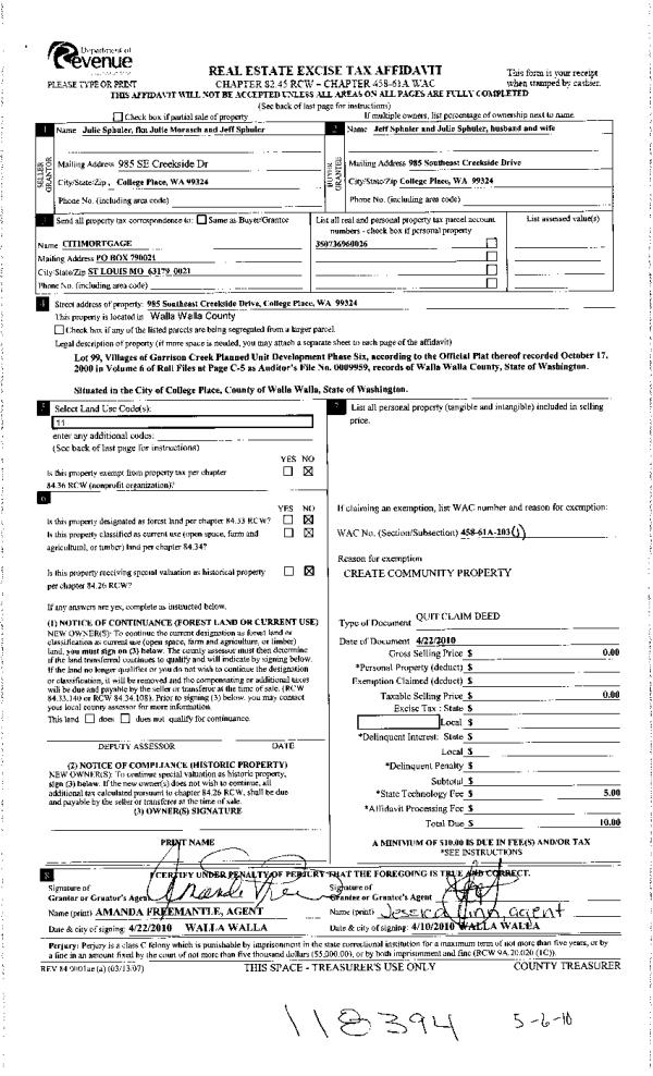 | 7 | 04/27/2010 | QCD | QUIT CLAIM DEED | SPHULER, JEFF | SPHULER, JEFF & JULIE | | | | 118394 | 2010-03270 |