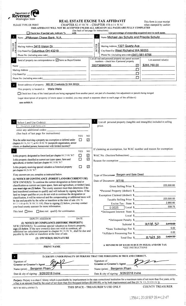 | 4 | 09/28/2018 | BARGAIN & | BARGAIN & SALE DEED | JPMORGAN CHASE BANK NATIONAL ASSOC | SCHULTZ MICHAEL JAY & PRISCILLA | | | $223,500.00 | 135641 | 2018-08106 |