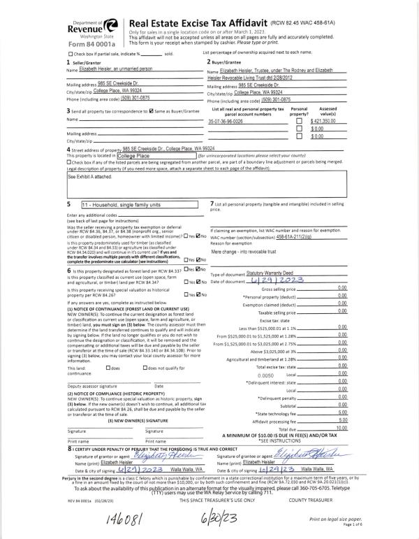 | 1 | 06/30/2023 | WARRANTY D | WARRANTY DEED | HEISLER ELIZABETH | RODNEY & ELIZABETH HEISLER REVOCABLE LIVING TRUST | | | | 146081 | 2023-03680 |