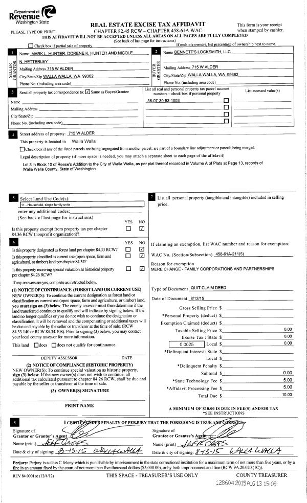 | 1 | 08/12/2015 | QCD | QUIT CLAIM DEED | HUNTER MARK L & DORENE K | BENNETTS LOCKSMITH LLC | | | $0.00 | 128604 | 2015-07098 |