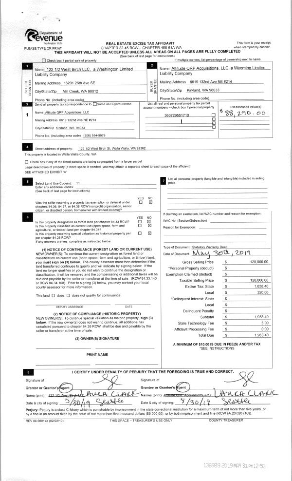 | 1 | 05/31/2019 | SWD | STATUTORY WARRANTY DEED | 122 1/2 WEST BIRCH LLC | ALTITUDE QRP ACQUISITIONS LLC | | | $128,000.00 | 136988 | 2019-03730 |