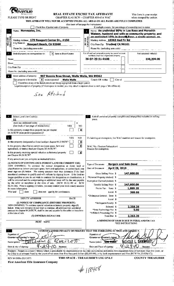 | 4 | 01/21/2010 | WARRANTY D | WARRANTY DEED | NORTHWEST TRUSTEE SERVICES INC | HOMESALES INC | | | $95,368.00 | 117993 | 2010-00634 |