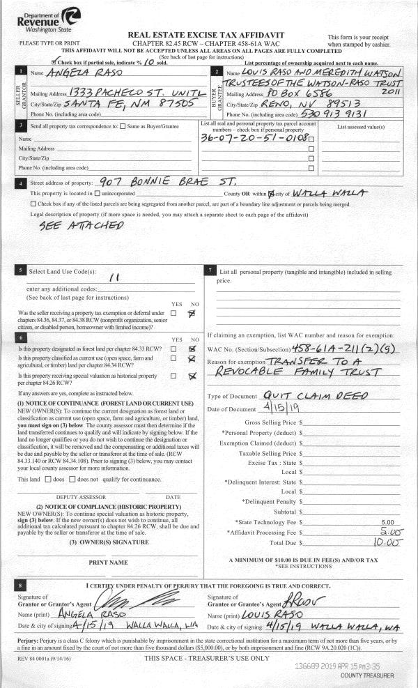 | 1 | 04/15/2019 | QCD | QUIT CLAIM DEED | WATSON-RASO TRUST 2011 & ANGELA RASO | WATSON RASO FAMILY TRUST | | | $0.00 | 136689 | 2019-02389 |