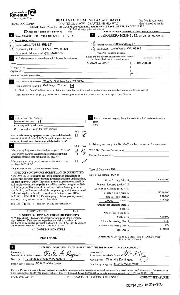 | 1 | 06/30/2017 | SWD | STATUTORY WARRANTY DEED | ROGERS CHARLES D & CHERYL A | DOMINGUEZ CHAUNDRA L | | | $225,000.00 | 132714 | 2017-05047 |