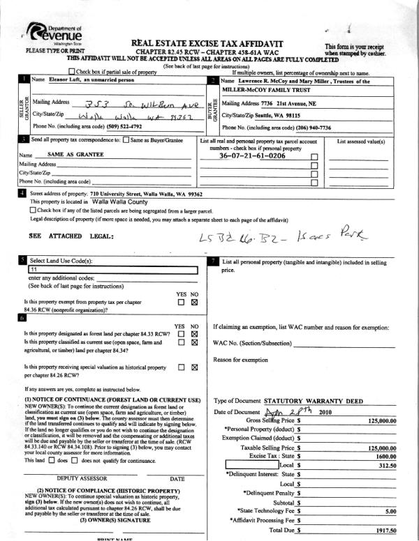 | 2 | 04/29/2010 | WARRANTY D | WARRANTY DEED | LUFT, ELEANOR | MC COY, LAWRENCE R & MARY MILL | | | $125,000.00 | 118399 | 2010-03336 |