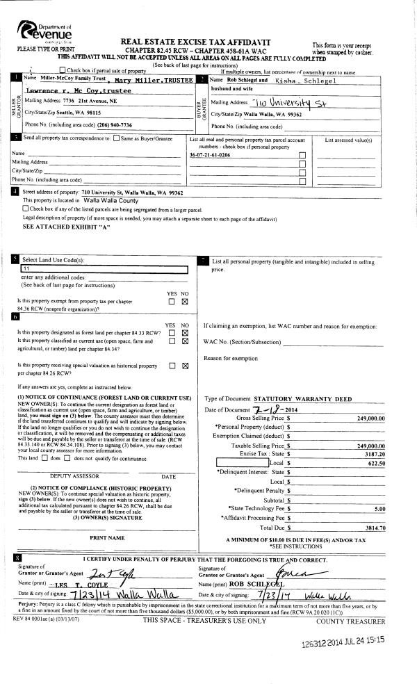 | 1 | 07/24/2014 | SWD | STATUTORY WARRANTY DEED | MC COY LAWRENCE R & MARY MILLER TRSTE | SCHLEGEL ROB & KISHA | | | $249,000.00 | 126312 | 2014-05213 |