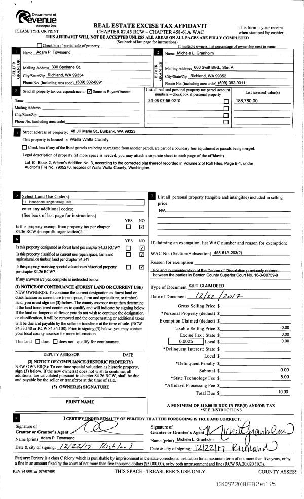 | 4 | 02/02/2018 | QCD | QUIT CLAIM DEED | TOWNSEND ADAM P & MICHELE L | GRANHOLM MICHELE L | | | $0.00 | 134097 | 2018-00940 |