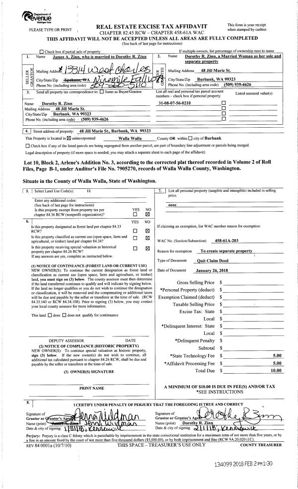 | 2 | 02/02/2018 | QCD | QUIT CLAIM DEED | ZINN JAMES A | ZINN DOROTHY R | | | | 134099 | 2018-00942 |