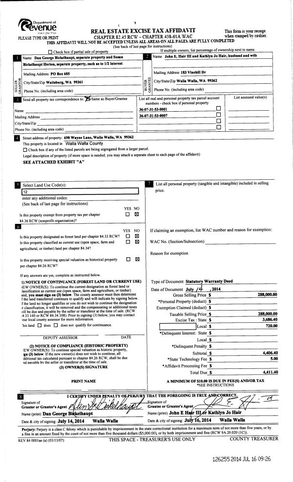 | 1 | 07/14/2014 | SWD | STATUTORY WARRANTY DEED | BICKELHAUPT DAN GEORGE | HAIR JOHN E III & KATHLYN JO | | | $288,000.00 | 126255 | 2014-04939 |