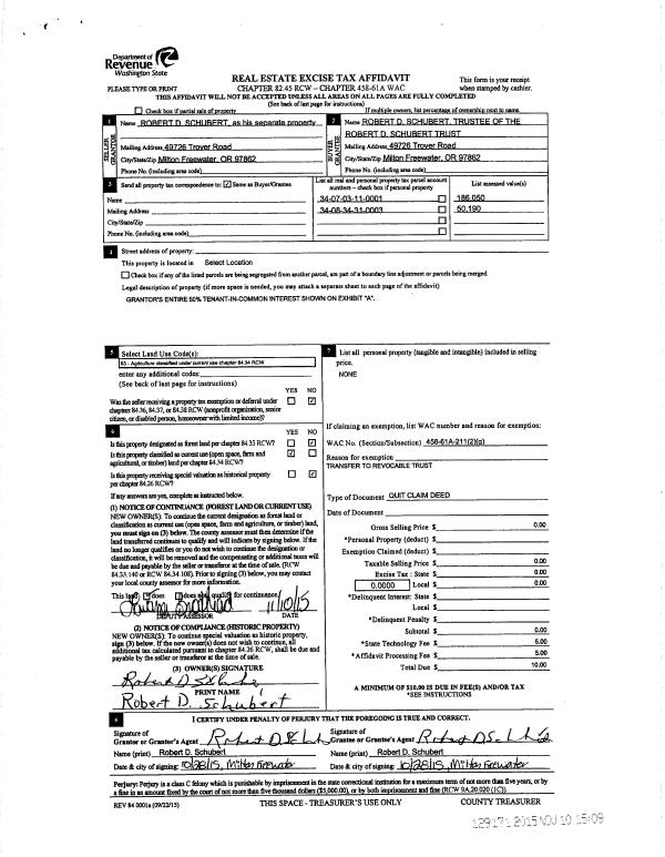 | 1 | 10/28/2015 | QCD | QUIT CLAIM DEED | SCHUBERT ROBERT D TRUST | SCHUBERT ROBERT D TRUST | 2 PARCELS | | | 129172 | 2015-09810 |