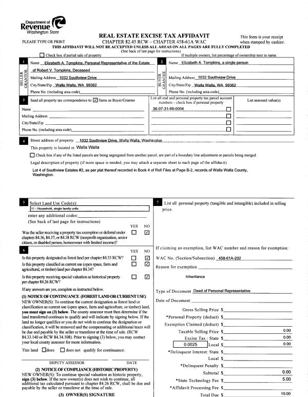 | 1 | 04/09/2014 | DPR | DEED OF PERSONAL REPRESENTATIVE | TOMPKINS ROBERT V & ELIZABETH A | TOMPKINS ELIZABETH A | | | | 125700 | 2014-02428 |