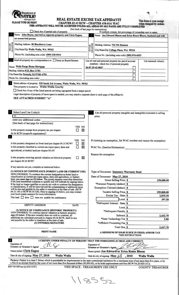 | 2 | 05/28/2010 | WARRANTY D | WARRANTY DEED | ROYSE, JOHN | BLOOM, JON EDWARD & ERICA RENE | | | $159,000.00 | 118552 | 2010-04182 |