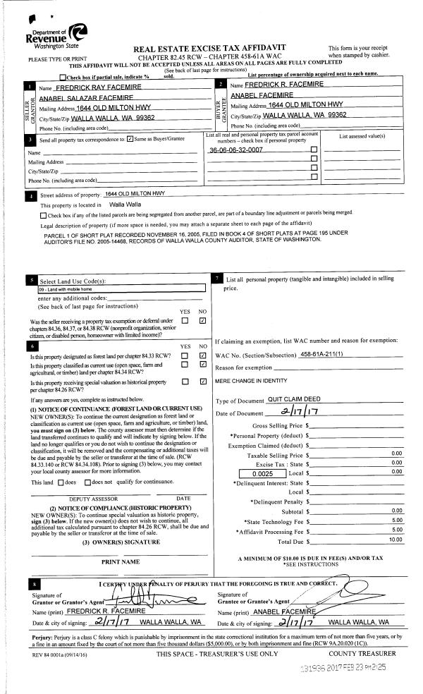 | 2 | 02/17/2017 | QCD | QUIT CLAIM DEED | FACEMIRE FREDRICK RAY & ANABEL SALAZAR | FACEMIRE FREDRICK R & ANABEL | | | | 131936 | 2017-01457 |