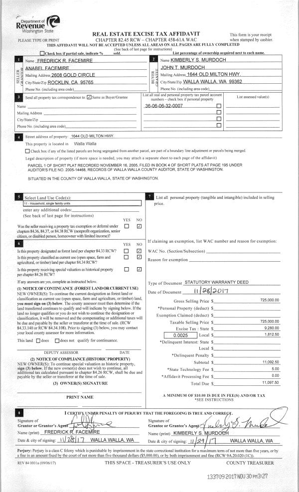 | 1 | 11/30/2017 | SWD | STATUTORY WARRANTY DEED | FACEMIRE FREDRICK R & ANABEL | MURDOCH JOHN T & KIMBERLY S | | | $725,000.00 | 133709 | 2017-09588 |
