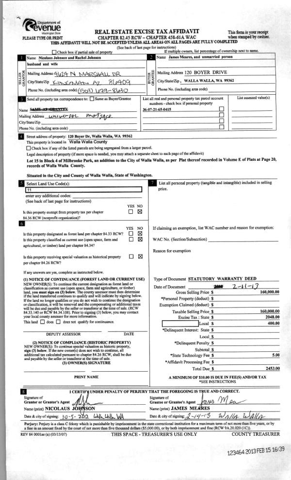 | 4 | 02/15/2013 | WARRANTY D | WARRANTY DEED | JOHNSON, NICOLAUS & RACHEL D | MEARES, JAMES | | | $160,000.00 | 123464 | 2013-01389 |