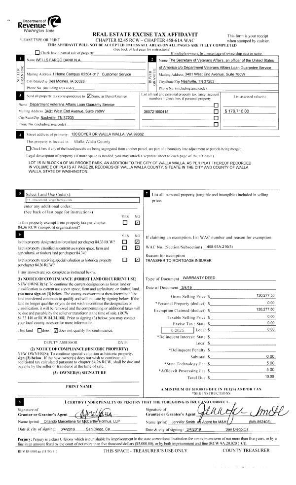 | 2 | 03/08/2019 | WARRANTY D | WARRANTY DEED | WELLS FARGO BANK | SECRETARY OF VETERANS AFFAIRS | | | $130,277.00 | 136499 | 2019-01541 |