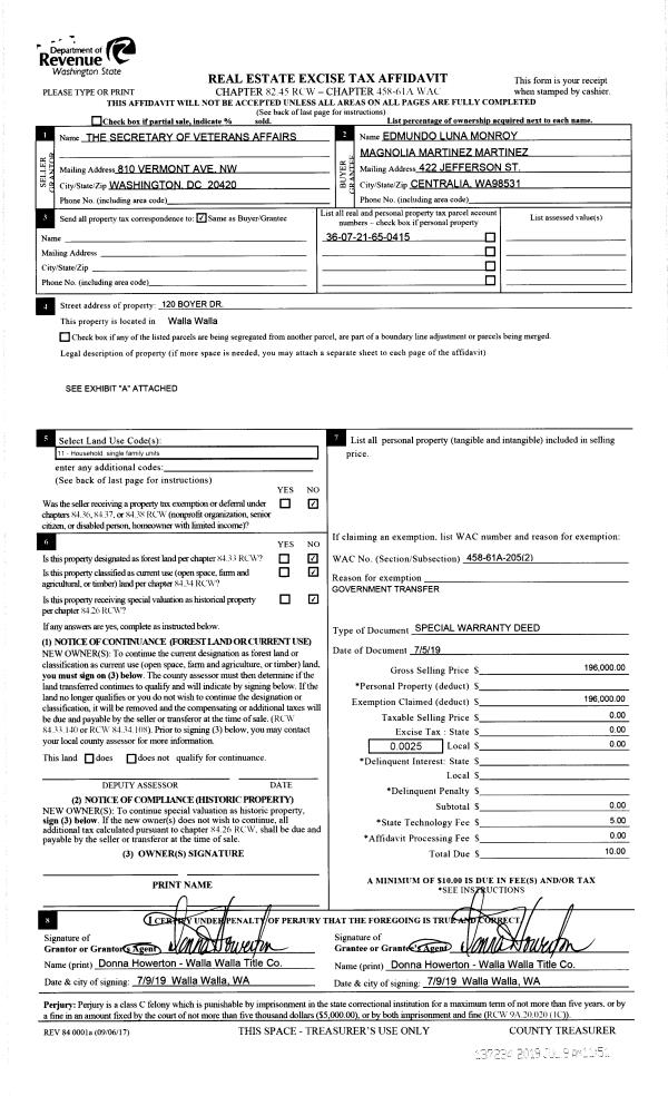| 1 | 07/09/2019 | SWP | Special Warranty Deed | SECRETARY OF VETERANS AFFAIRS | MONROY EDMUNDO LUNA | | | $196,000.00 | 137234 | 2019-04878 |