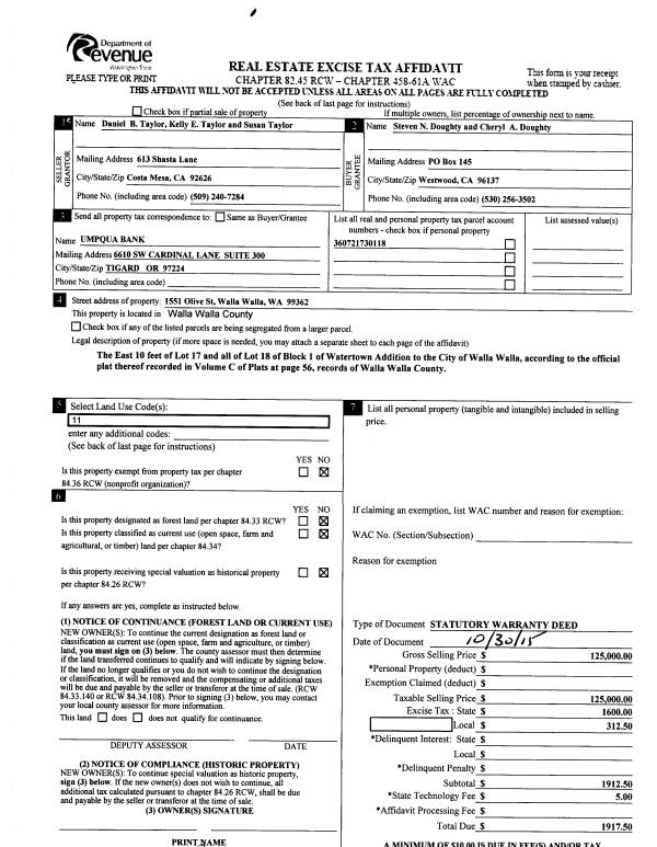 | 3 | 11/04/2015 | SWD | STATUTORY WARRANTY DEED | TAYLOR DANIEL B | DOUGHTY STEVEN N & CHERYL A | | | $125,000.00 | 129125 | 2015-09598 |
