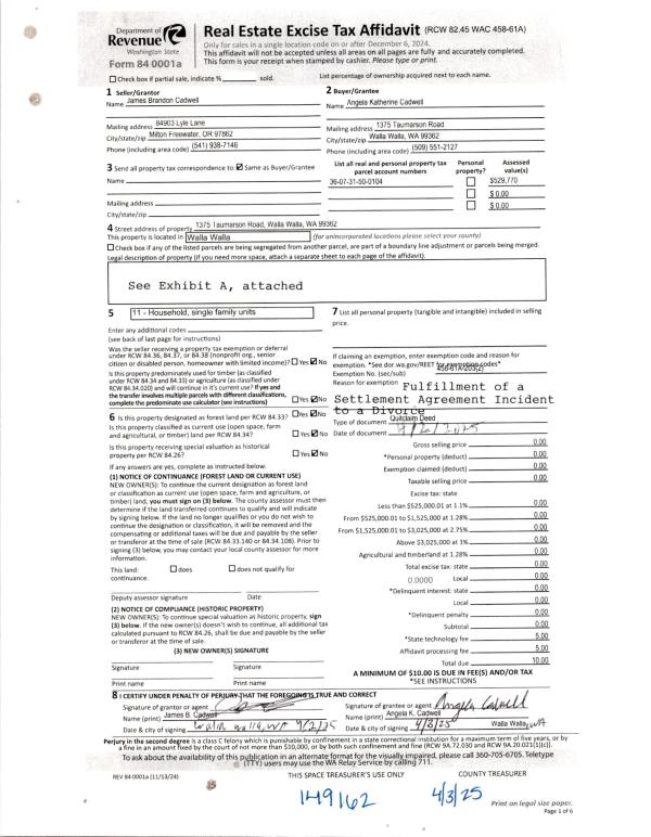 | 1 | 04/03/2025 | QCD | QUIT CLAIM DEED | CADWELL JAMES BRANDON & ANGELA KATHERINE | CADWELL ANGELA KATHERINE | | | | 149162 | 2025-01741 |