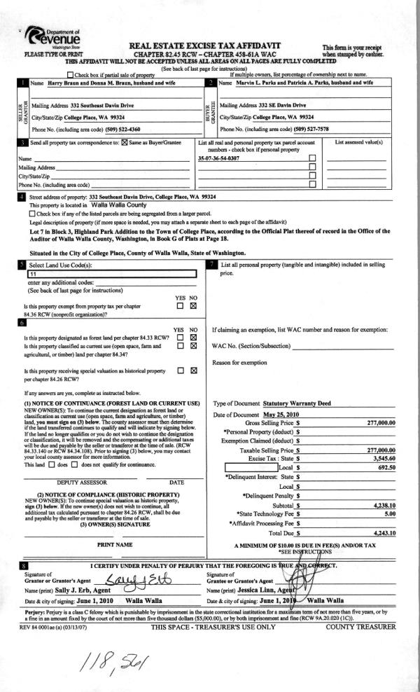 | 3 | 06/02/2010 | WARRANTY D | WARRANTY DEED | BRAUN, HARRY | PARKS, MARVIN L & PATRICIA A | | | $277,000.00 | 118561 | 2010-04248 |
