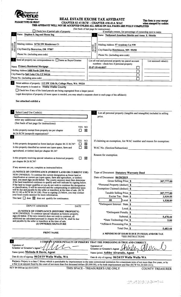 | 2 | 06/24/2019 | SWD | STATUTORY WARRANTY DEED | ING STEPHEN S & SHONA | SHIELDS NATHANAEL JONATHAN | | | $307,777.00 | 137145 | 2019-04472 |