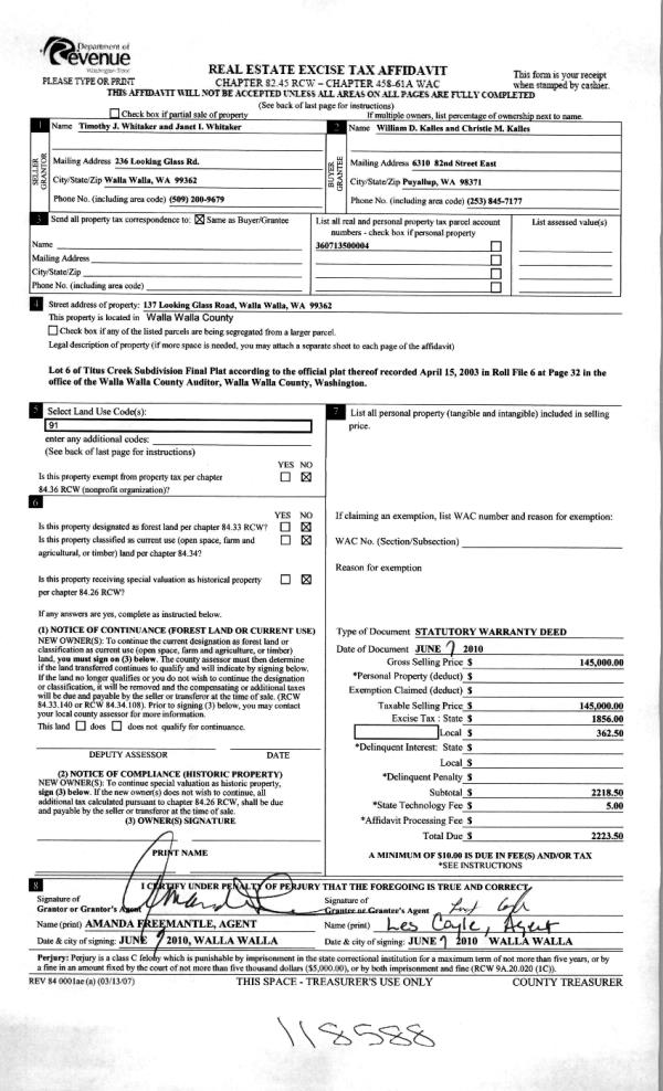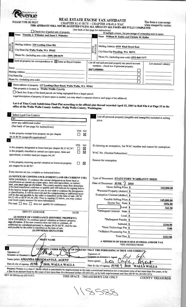 | 2 | 06/07/2010 | WARRANTY D | WARRANTY DEED | WHITAKER, TIMOTHY J | KALLES, WILLIAM D & CHRISTIE M | | | $145,000.00 | 118588 | 2010-04377 |