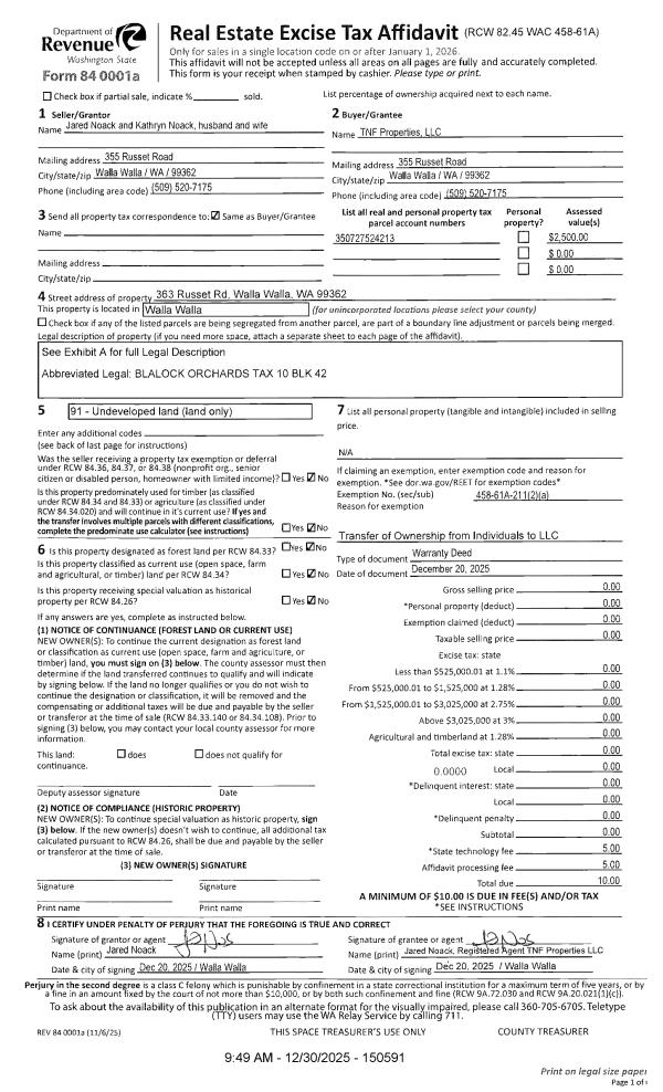 | 1 | 12/31/2025 | WARRANTY D | WARRANTY DEED | NOACK JARED & KATHRYN | TNF PROPERTIES LLC | | | | 150591 | 2025-08046 |