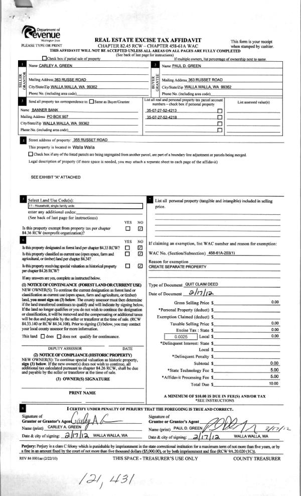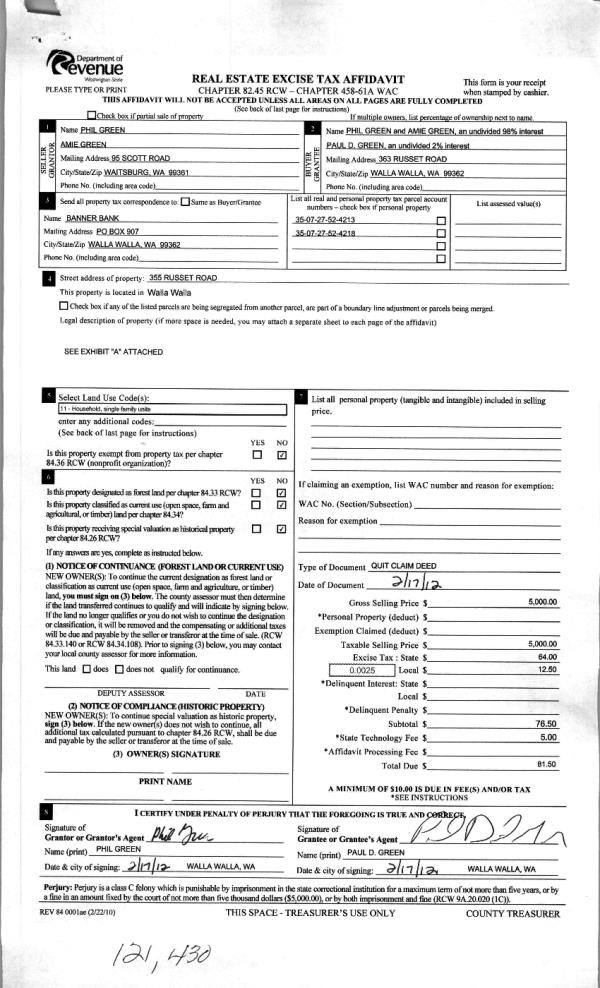 | 4 | 02/23/2012 | QCD | QUIT CLAIM DEED | GREEN, PHIL & AMIE | GREEN PHIL & AMIE | | | | 121430 | 2012-01534 |