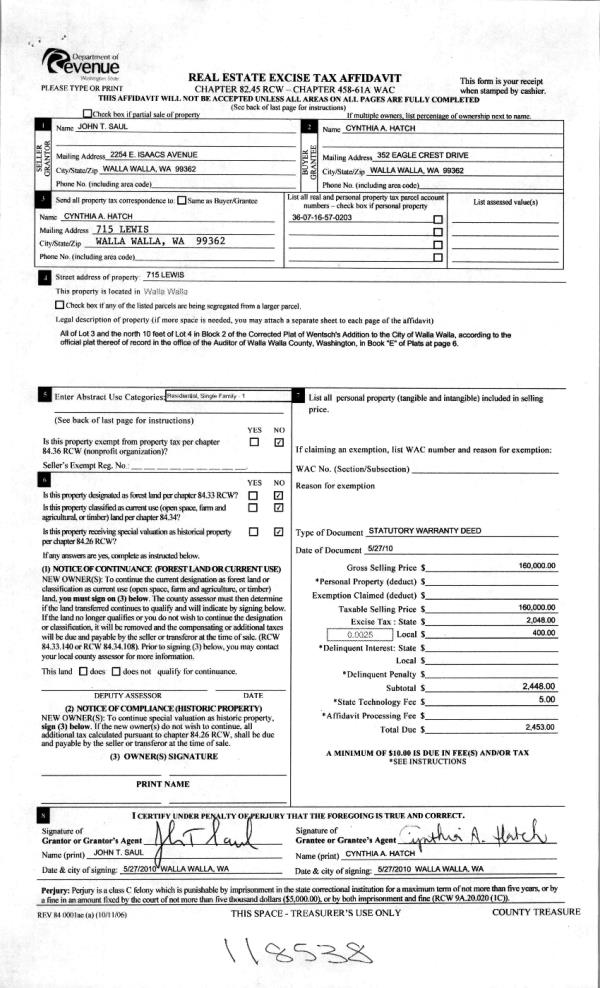 | 3 | 05/28/2010 | WARRANTY D | WARRANTY DEED | SAUL, JOHN T | HATCH, CYNTHIA A | | | $160,000.00 | 118538 | 2010-04149 |