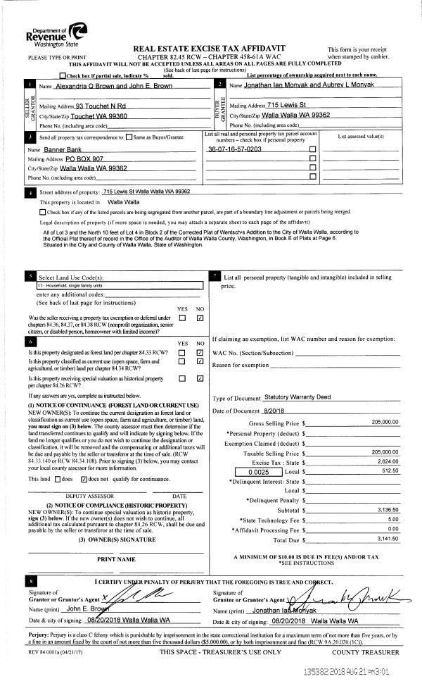 | 1 | 08/21/2018 | SWD | STATUTORY WARRANTY DEED | ZEHNER ALEXANDRIA | MONYAK JONATHON IAN & AUBREY L | | | $205,000.00 | 135382 | 2018-06905 |